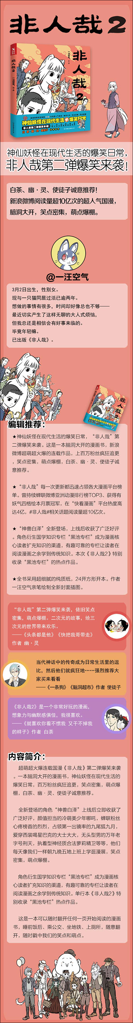 超萌超火爆连载国漫《非人哉》第二弹爆笑来袭。一本脑洞大开的漫画书,神仙妖怪在现代生活的爆笑日常,百万粉丝疯狂追更,笑点密集,萌点爆棚,白茶、幽·灵、使徒子诚意推荐。全新登场的角色“神兽白泽”上线后立即收获了广泛好评,颜值担当的冷萌美少年哪吒,蝉联粉丝心疼榜首的烈烈,占领第一出镜率的九尾狐九月,爱穿西装喝星巴克的大士大大,无头型男的万年老字号刑天,执着型神经质合法萝莉精卫等等,他们每天像我们一样朝九晚五地上班上学逛漫展,笑点密集,萌点爆棚。角色衍生国学知识专栏“黑池专栏”成为漫画核心读者扩充知识的渠道,有趣可靠的专栏让读者在阅读漫画之余学到传统知识。单行本《非人哉2》特别收录“黑池专栏”热点作品。这是一本可以随时翻开任何一页开始阅读的漫画书,睡前饭后、乘公交、坐地铁、上厕所,随意翻开,随时戳中我们的笑点和萌点。海报: